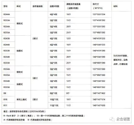 下面我會分享一下我們永合創(chuàng)信不銹鋼凍存架參數(shù)及對應配備的凍存盒數(shù)量。有需要的朋友們可以根據(jù)我們的參數(shù)表來確定您需要什么樣的凍存架;如果沒有合適您的,也沒有關系,您可以提供具體參數(shù),我們幫您量身定制!