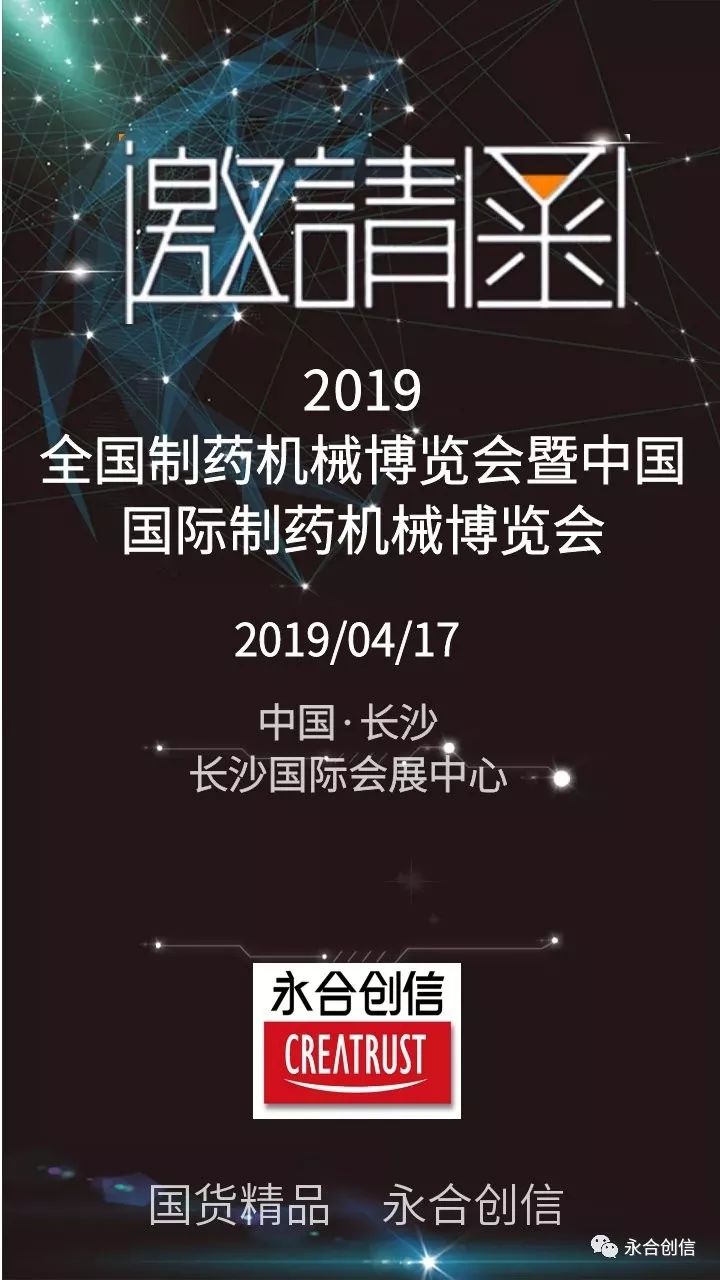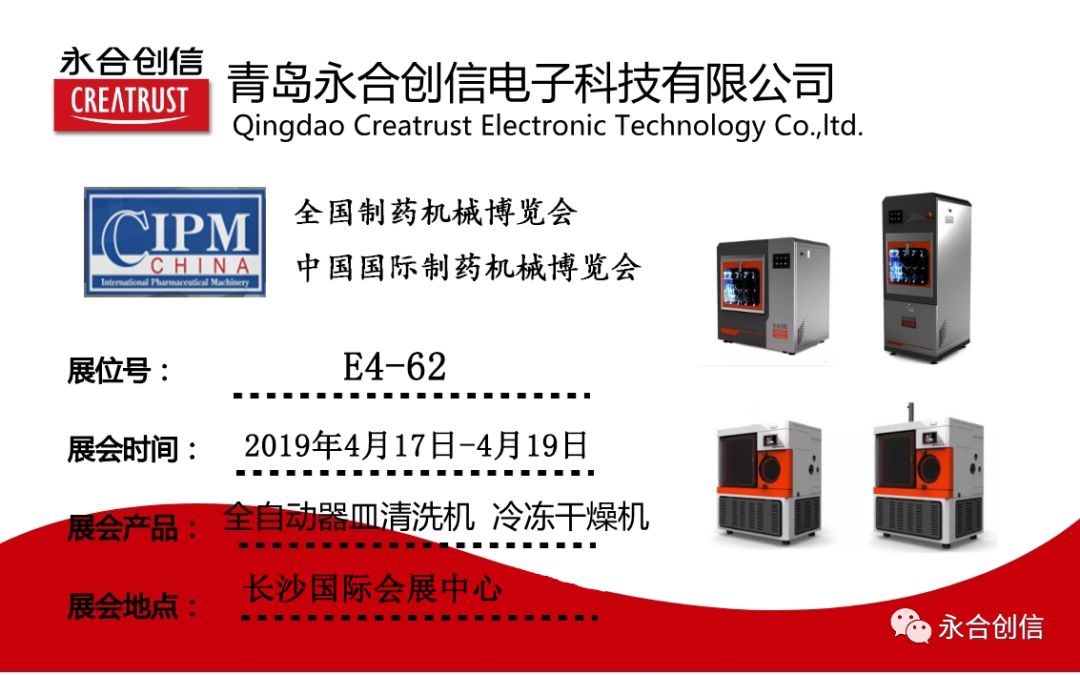 致力于成為全球?qū)嶒炇翌I(lǐng)域的專業(yè)服務(wù)商青島永合創(chuàng)信電子科技有限公司誠邀您參加2019年全國制藥機械博覽會暨中國國際制藥機械博覽會,關(guān)注永合創(chuàng)信,關(guān)注“CREATRUST”全自動器皿清洗機、冷凍干燥機。
