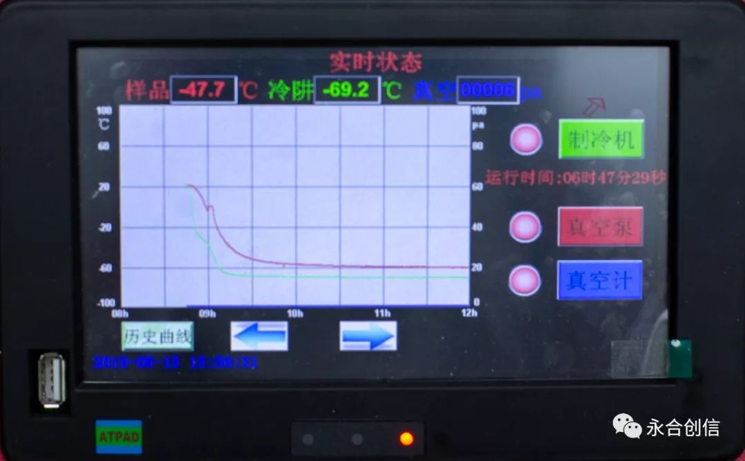 4) 經(jīng)過長時(shí)間的干燥運(yùn)轉(zhuǎn),查看樣品曲線,目測樣品已完全干燥,即可打開真空充氣閥后,點(diǎn)擊“真空泵”按鈕,真空泵停止運(yùn)行。點(diǎn)擊“真空計(jì)”按鈕,真空計(jì)關(guān)閉。