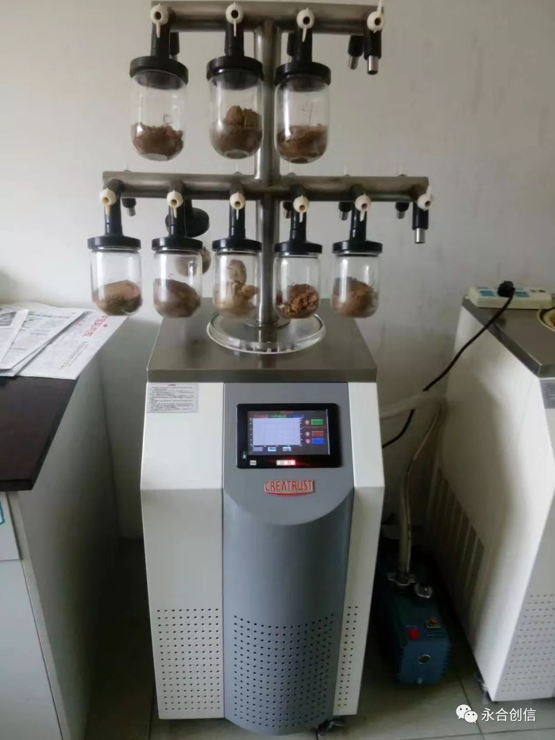 5) 如果干燥瓶與托盤內(nèi)樣品全部干燥結(jié)束,要先取下干燥瓶,然后充氣、關(guān)閉真空泵、真空計(jì)。取下玻璃罩,保存樣品。請勿帶凍干瓶取下玻璃罩。
