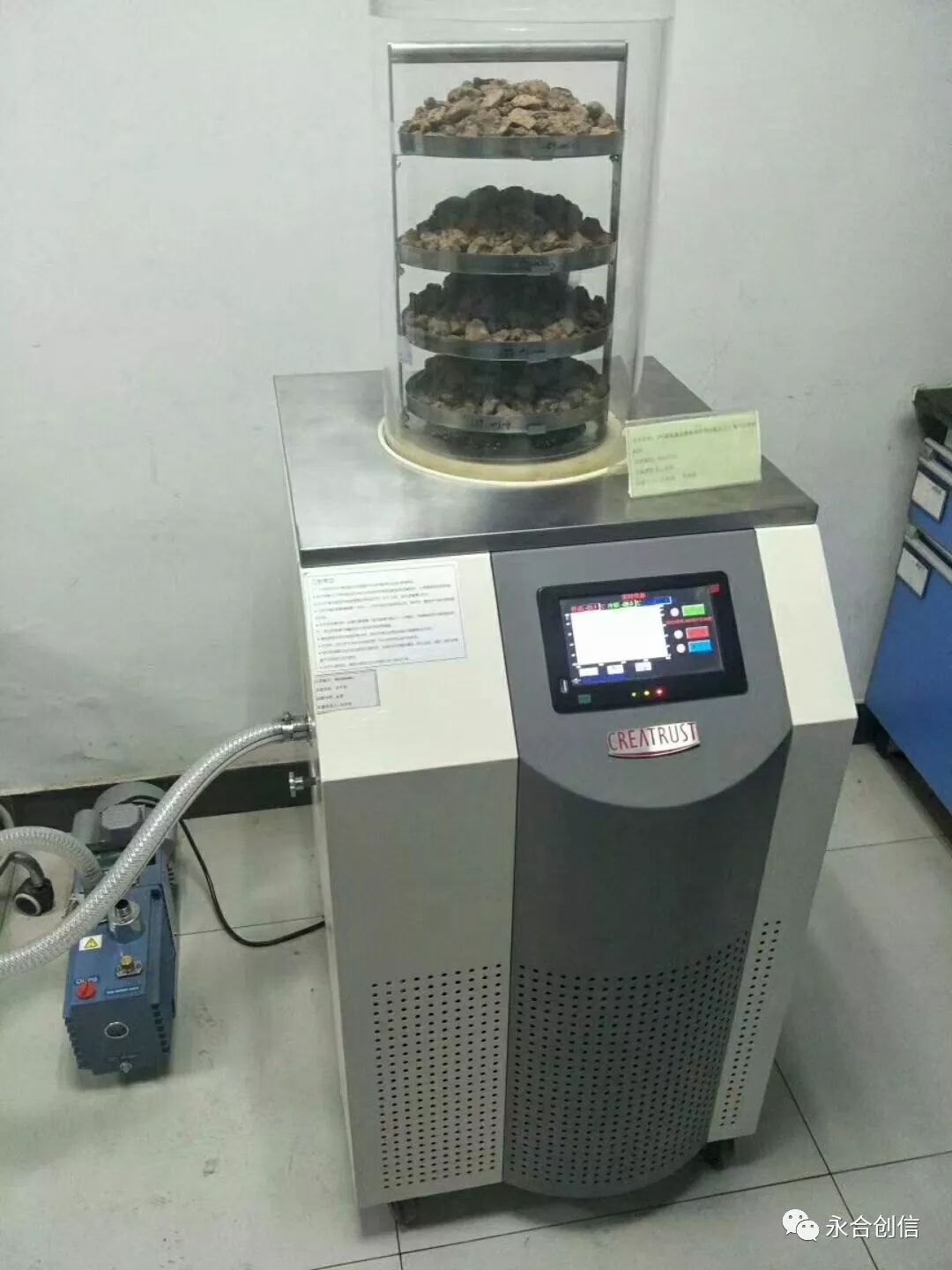 d、 點(diǎn)擊屏幕上“真空計(jì)”按鈕,屏幕顯示真空度為110KPa,然后點(diǎn)擊“真空泵”按鈕開啟真空泵。真空度迅速下降,至真空 度≤10Pa 為正常,干燥正式開始(建議干燥20小時(shí)左右,具體根據(jù)物料含水量不同,由用戶自行確定)。
