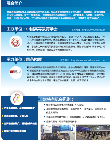 全國高教儀器設(shè)備展示會(huì)歷經(jīng)20余年的發(fā)展,成為高等教育領(lǐng)域舉辦時(shí)間最長、規(guī)模最大、影響力最強(qiáng)的專業(yè)品牌展會(huì),創(chuàng)立于1992年秋,已成功舉辦48屆,2015年全國高教儀器設(shè)備展示會(huì)被商務(wù)部納入 “商務(wù)部引導(dǎo)支持展會(huì)”。